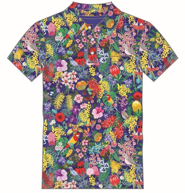 This art is by Annette Winter Designs, a South Australian illustrator who combines graphic design and original artwork to create visually appealing repeat patterns. It is the 2026 addition to the popular and unique Colour the Green range of Carnival bowls polos.